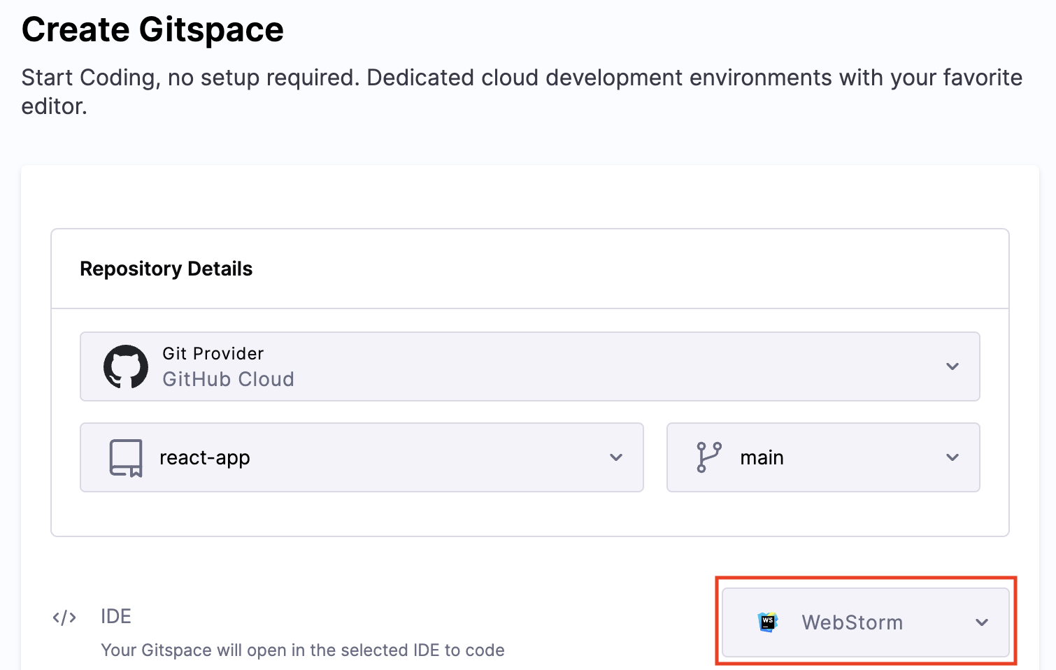 Select "WebStorm" as the IDE during Gitspace creation.