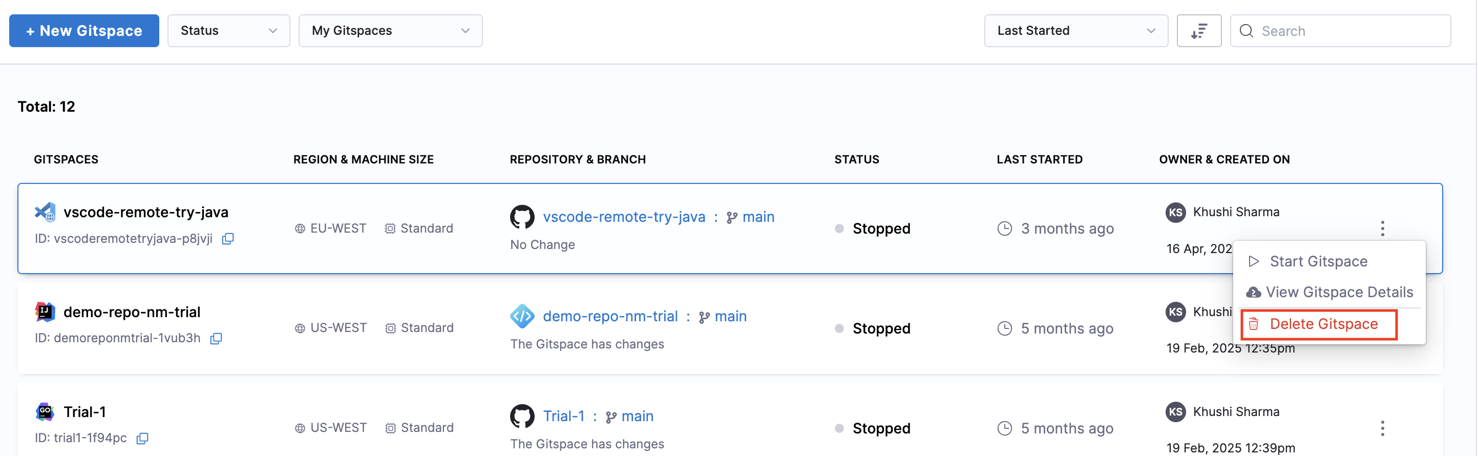 • Deleting from the Gitspace Details UI