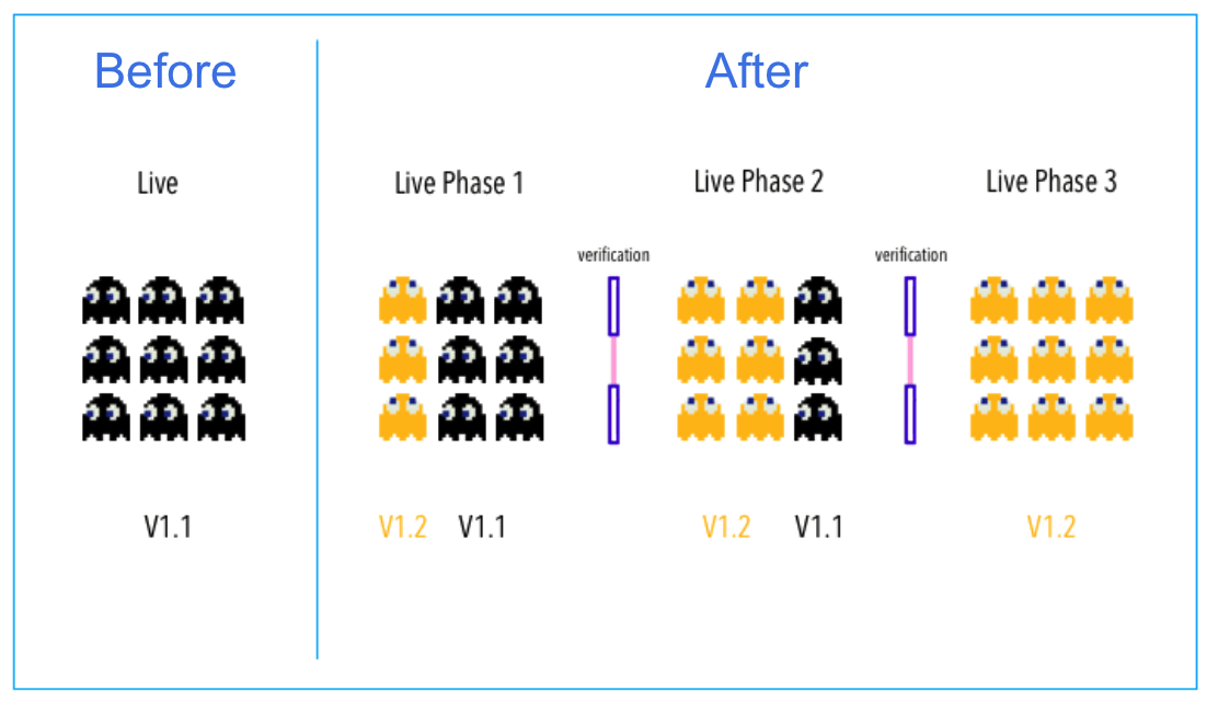 In a typical Canary deployment, all nodes in a single environment are incrementally updated in small phases, with each phase requiring a verification/gate to proceed to the next phase.
