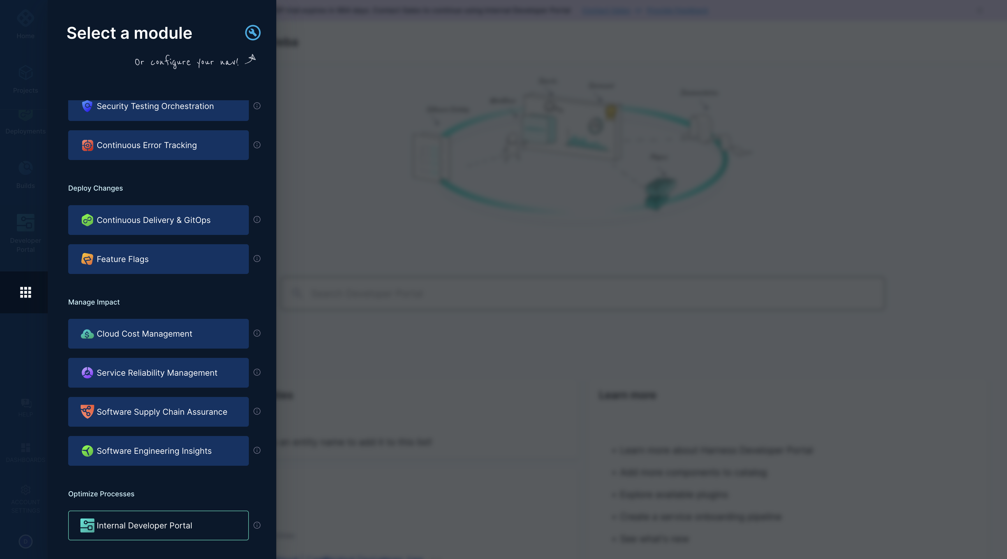 - You land on the IDP module by navigating from the sidebar after logging into your Harness account. We strongly recommend users to follow the onboarding guide selecting the Get Started, for a seamless onboarding resulting in a catalog with software components.